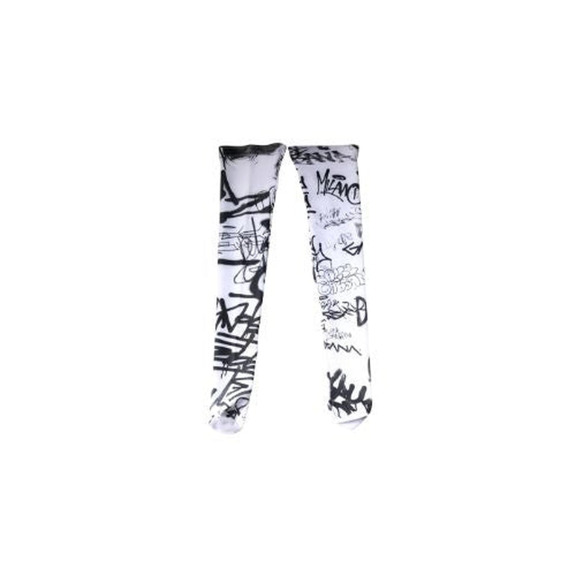 Downtown attitude for Brooklyn’s gallery circuit. These Dolce & Gabbana over-the-calf stockings from Dolce & Gabbana are cut in a soft, stretchy knit and splashed with a black-on-white graffiti print—graphic, irreverent, and made to peek out between loafers and a cropped hem. Lightweight enough for all-day wear; bold enough to stand alone.